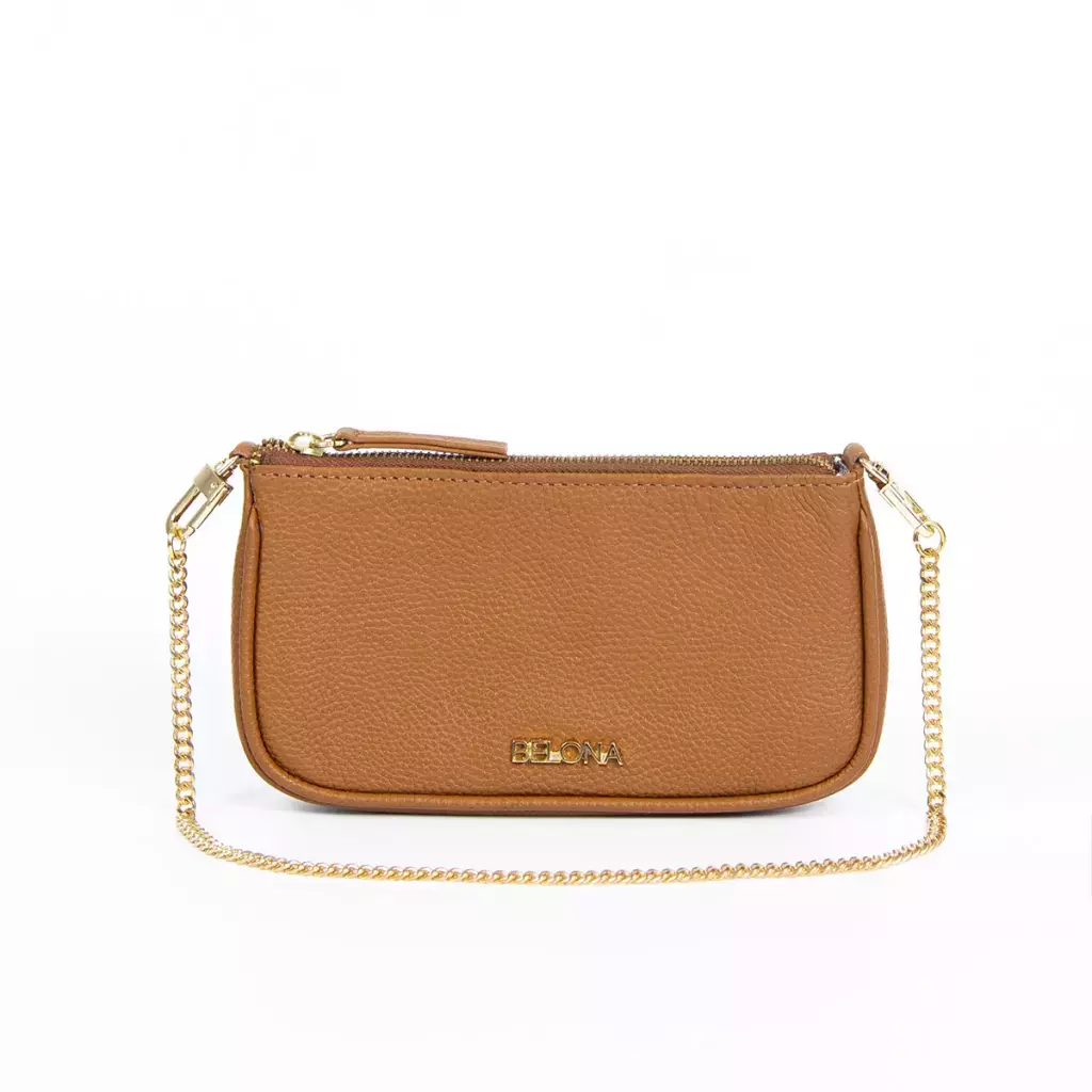 Bandolera de cuero graneado con doble compartimento y cadena. Posee cierre en ambos compartimentos. Correa desmontable y regulable.